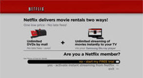1. The Netflix registration screen appears, select Yes- activate instant streaming from Netflix, and then press the Enter button on your remote control. The Netflix screen reloads and a unique activation code is displayed, along with a direct link to activate your account.