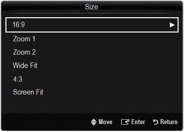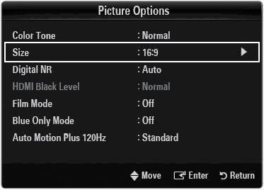 - In the Picture Options menu use the ▲ or ▼ arrow button to select the Size option,