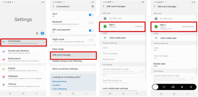 From Apps screen, tap Settings > Connections > SIM card manager >