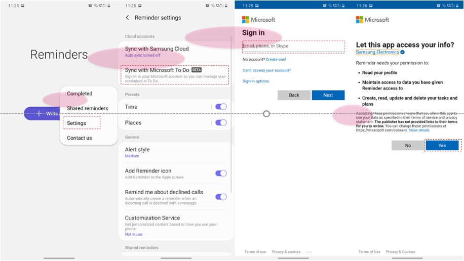 Accept the permission requested to add Microsoft To Do in Samsung Reminder.