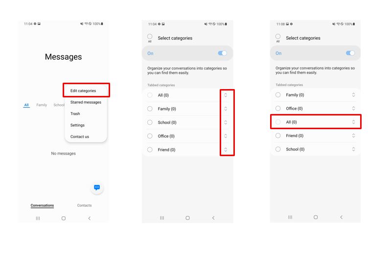 With the new update, a feature has been added that changes the category order in the message conversation list. As a result, when you create a new category and move it to the top, it will now display as the first category by default when accessing the Messages app, instead of appearing under the 'All conversations' category.