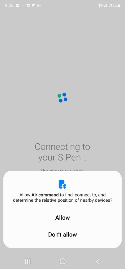 after plug in S pen, tap the notification then allow permission of 'nearby