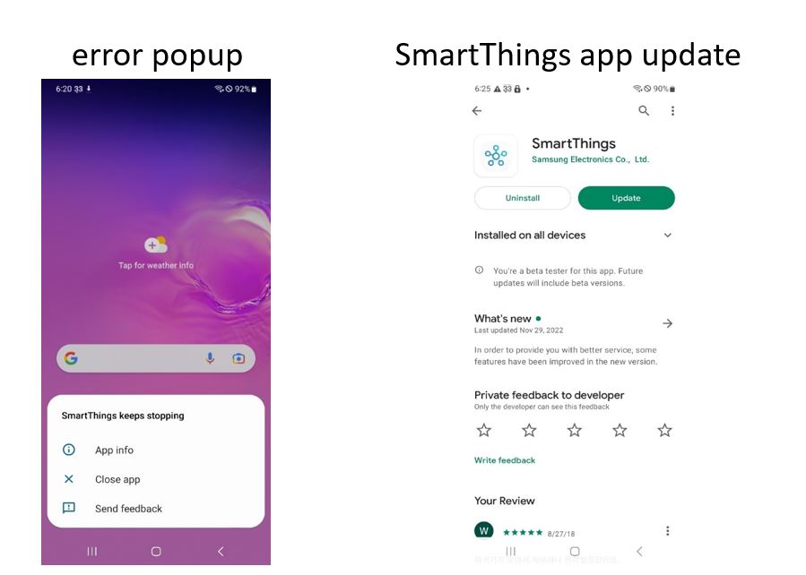 Identify the issue: SmartThings app crash with