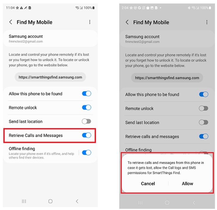 this phone to be found > Turn on 'Retrieve calls and messages'.