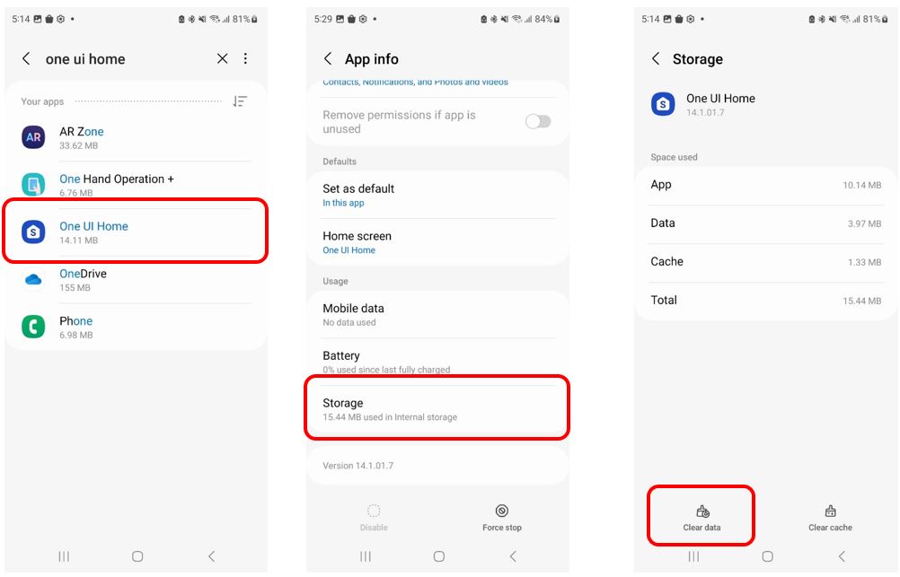 'Clear data' through One UI Home > Storage > tab 'Clear data', however