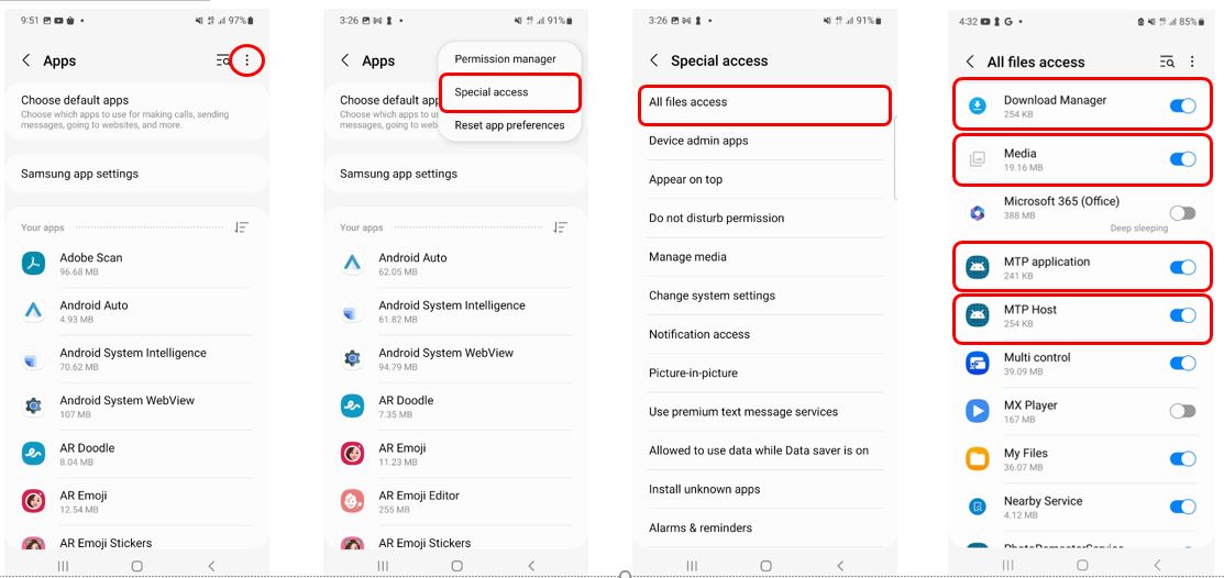 on �Download Manager', �Media', �MTP application', �MTP Host' > restart the