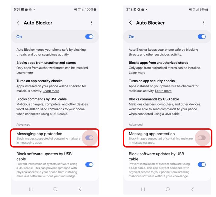 - When you turn on 'Auto Blocker', Samsung Message