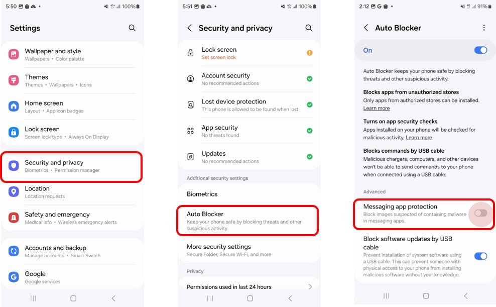 privacy > Auto Blocker (Default : Off) > Messaging app protection