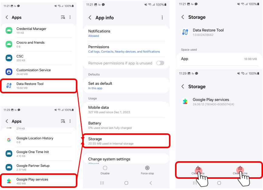 by deleting data and cache from the Data Restore Tool and the Google Play services