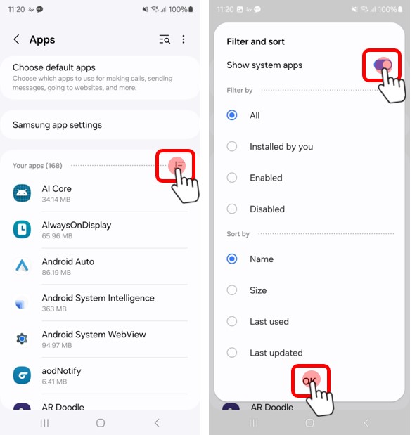 Sort by(Filter and sort) > enable 'Show system apps' > tap