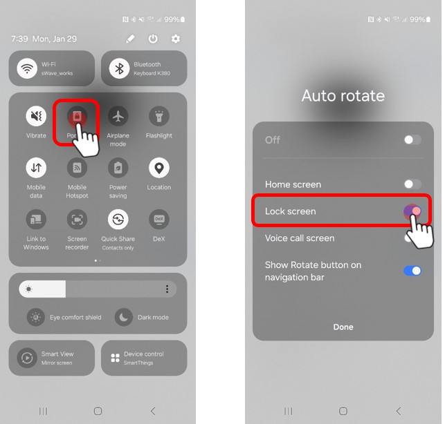 > touch and hold 'Portrait/Auto rotate' icon > turn On/Off for