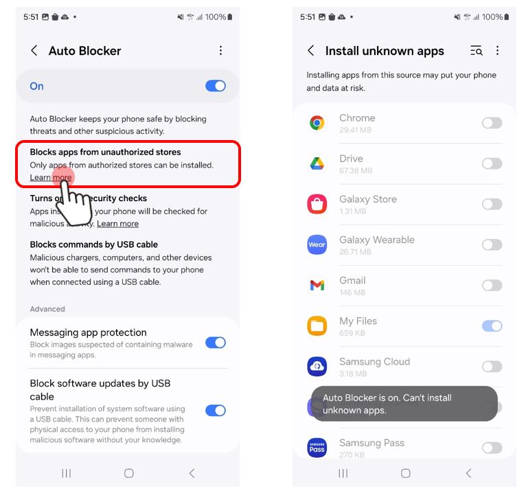 menu on 'Blocks apps from unauthorized sources' in Auto Blocker.