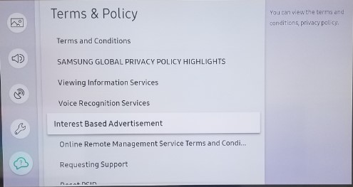 - TV Menu > Support > Terms & Condition