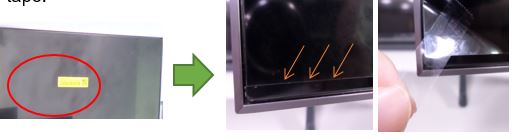 in the corners (often yellow or blue) or a barcode sticker on the screen.